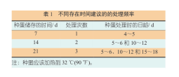 在种蛋保存的第 4 ~ 5 天时进行首次加热处理,并在必要时间隔 5 d ~ 6 d 后再次处理 ( 表 1)。