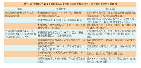 表 2 将列出在 SPIDES 方法没有改善孵化率或没能使孵化率损失恢复 60% ~ 70% 时应考虑的可能原因 ( 表 2)。