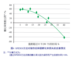 充分执行 SPIDES 法, 能够使在未处理储存种蛋上观察到的孵化率下降情况恢复 60%, 甚至更多。如果当前由于贮存的原因导致孵化率损失 10%, 采用 SPIDES 法后, 孵化率能提高 6% ~ 7%。 随着种蛋储存时间的延长, 改善的效果越明显 ( 图 2 和 3)。由于 SPIDES 法模仿鸡蛋的自然孵化过程, 因此研究发现坚固耐用, 且具有相当大的灵活性。 例如,实施 SPIDES 方法时可在较大范围内对加热速度、最终温度和目标天数进行调整以达到良好的效果。